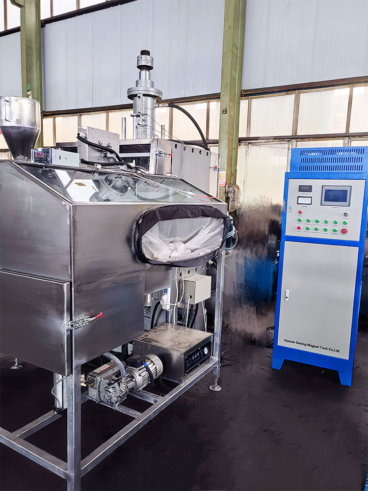 Automatic 2: (the automatic mold is placed between the two poles with adjusted spacing and clamped) press the "cycle" button → stop the lower cylinder (loading) → press the "cycle" button again → the upper cylinder and the lower cylinder close the mold and stop → the DC orientation → the orientation value reaches the maximum setting, the upper and lower cylinders simultaneously press → maintain pressure → demagnetize → upper cylinder upper → lower cylinder upper ejection stop → (reclaim). Go back to execution.