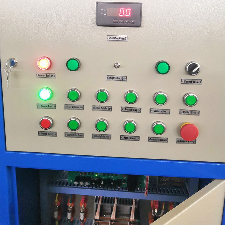 It is mainly composed of the cabinet, operation panel, PLC and related components, DC power supply and related components, sensors, etc. The PLC of this machine adopts the OMRON company controller, and all actions are controlled by the PLC. The direct current power supply provides the electromagnet with continuously adjustable forward and reverse direct current. The sensor of this machine has a proximity switch to limit the position of the oil cylinder.