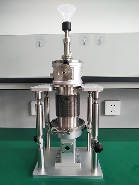 The low-pressure refrigerant is introduced into the cryostat from the liquid inlet, and then introduced into the evaporator at the bottom of the cryostat through the capillary tube inside the cryostat. A heater and a temperature sensor are also installed on the evaporator of the cryostat. , the steam whose temperature is controlled by the temperature controller is sprayed into the sample chamber. After cooling the sample, the steam is discharged through the air outlet pipe into the atmosphere or into a gas recovery device. In the design of this type of cryostat, in order to facilitate customers to easily load samples, the sample can be loaded from the top of the cryostat through the sample rod. The bottom of the cryostat uses a compact design with a vacuum cover. has a smaller duty cycle and is more suitable for measurements in magnetic fields.